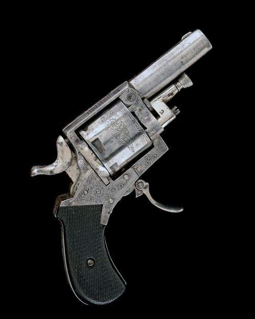 Belgian, circa 1880, with ovoid 2 1/4in. barrel, shallow crescent fore-sight, sighting groove to the top-strap, the top-strap marked 'BRITISH BULLDOG', borderline and other engraved frame, plain cylinder, chequered walnut semi-birdshead grips, spurred hammer and folding trigger (return-spring weak), traces of nickel-plated finish