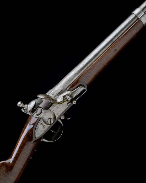 Continental, probably French, circa 1831, with brushed bright 40in. barrel, the top-tang with sighting groove, French-style military lock with illegible makers stamp, brass pan, walnut three-quarter stock, the right side of butt stamped with an illegible crest dated '1831', dished cheek-piece, iron furniture including trigger-guard tang with finger-ribs, two barrel bands and twin-banded nose-cap, iron ramrod, some staining to iron surfaces