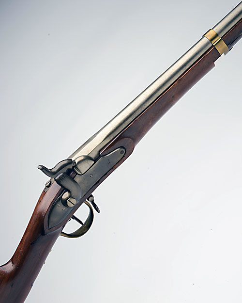A .69 PERCUSSION CONTINENTAL SERVICE MUSKET, UNSIGNED, serial no. 35, circa 1854, with 40 1/2in. barrel, plain lock possibly converted from flintlock, walnut three-quarter stock, brass and iron furniture, some mild surface frosting