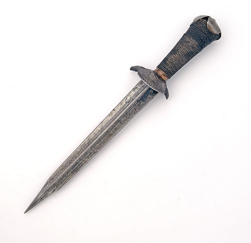 AN INTERESTING MEDIEVAL ARMOUR-PIERCING DAGGER WITH DAMASCUS STEEL BLADE, with 9 1/2in. cruciform blade with concave sides, swollen wire-bound grip and iron cross-guard and pommel