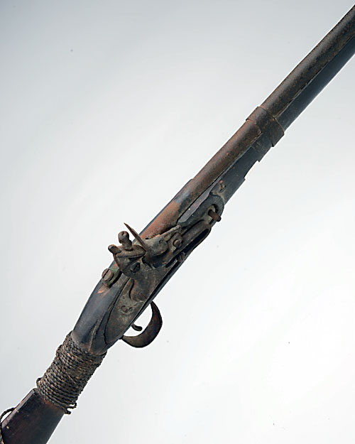 TWO FLINTLOCK TRADE-MUSKETS, probably African, the first in 12-bore with a 31in. barrel, the second, 25-bore with a 42 1/2in. barrel, both corroded with other losses