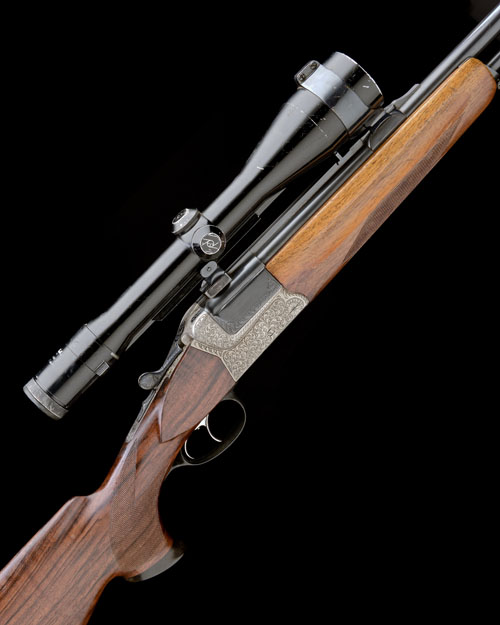 25in. Boehler Spezial steel nitro rifle barrels with matt sight rib, ramp-mounted blade fore-sight, mounted with a Zeiss Diavari telescopic sight in quickly-detachable mounts, no mid rib, individual fore-end;