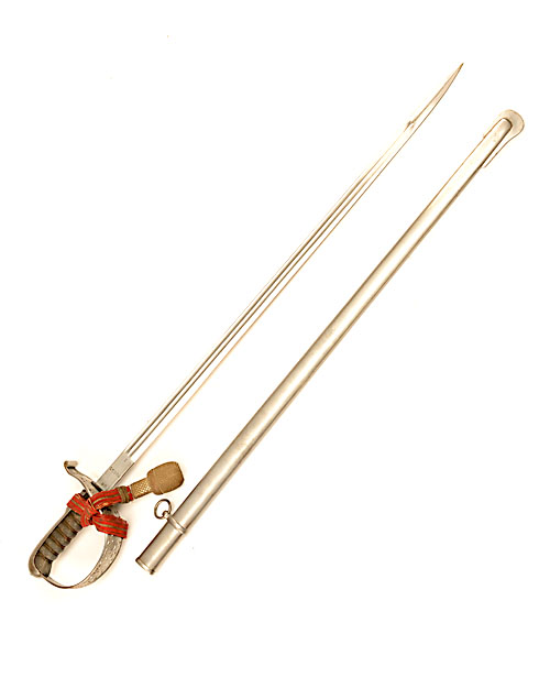 A SWISS INFANTRY OFFICERS SWORD SIGNED 'WAFFENFABRIK NEUHAUSEN', serial no. 26904, dated for 1929, with straight double-fullered 30in. blade, pierced knuckle-bow bearing a Swiss crest, wire-bound sharkskin grip, complete with its bullion sword-knot and steel scabbard