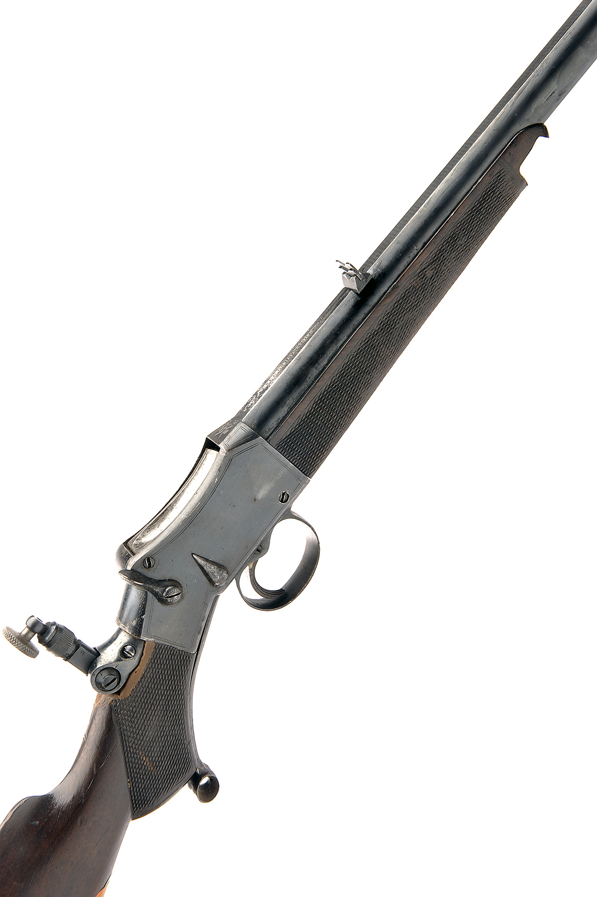 ** W.W. GREENER .22 L. MARTINI-ACTION SINGLE-SHOT TARGET RIFLE, serial no. 27428, 26 1/2in. nitro barrel, block-mounted blade fore-sight, V-notch rear-sight with 1 x folding, crude fitted tang folding peep-sight,
