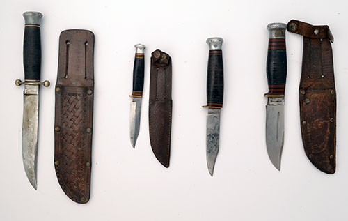 FOUR LEATHER HANDLED SPORTING KNIVES, various ages, makers and conditions, the longest with 6in. blade, the shortest 3in., one missing its sheath