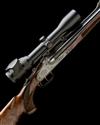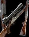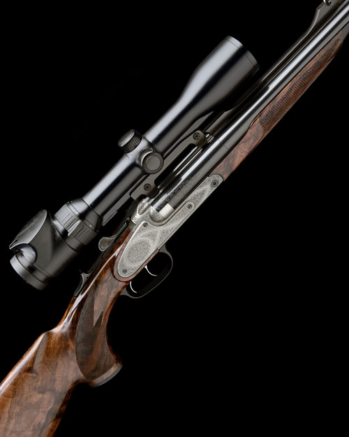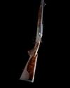 24 3/8in. nitro barrels with partially matted rib, open sights and ramped bead fore-sight, the breech end mounted with a Swarovski Z6i 1,7-10x42 telescopic sight in quickly-detachable mounts, Blaser patent action with hold-open toplever, detachable tilting block locking system, the triggerplate with tilting block release button, direct triggers, double-lock manual cocking system, acanthus scroll engraving, old silver finish, 14 73/4in. highly-figured pistolgrip stock with cheekpiece, sling eyes, pistolgrip-cap, including 7/8in. rubber recoil pad, beavertail fore-end with Deeley & Edge style release and sculpted horn finial, 12lb. 3oz., in its universal case with sighting target