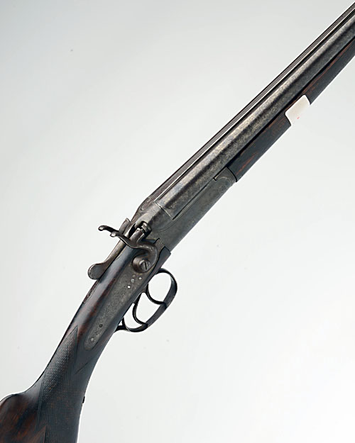 A BELGIAN .410 DOUBLE-BARRELLED TOPLEVER HAMMERGUN, serial no. 6730, 27in. black powder only barrels (loose on action), 2 1/2in. chambers, bored approx. true cyl in both, generally worn with some external pitting, fore-end with replacement screws and crack to wood
