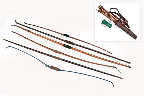 FIVE ASSORTED VINTAGE LONG BOWS of various sizes, one marked '20' and 'FELTHAM. LONDON'; one marked '44' and 'MADLE FRITH ST. LONDON'; one marked '10' and 'ARMSTRONG. LONDON'; the other two unmarked; TOGETHER WITH A 'SEEFAB CENTAUR' and a leather quiver with various arrows