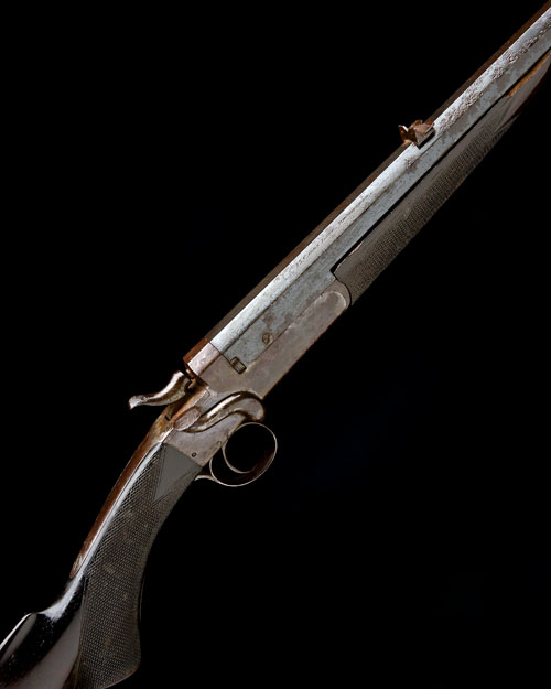 A .300 (SHERWOOD) SINGLE-SHOT ROOK-RIFLE, MODEL 'TRANTER'S PATENT', serial no. 37001, circa 1900, with octagonal 26in. barrel (some pitting), matted top-flat, the two adjacent flats signed 'WILLIAM POWELL' and '13 CARRS LANE BIRMINGHAM' respectively, dove-tailed fore-sight, dove-tailed standing notch rear-sight with additional folding leaf, plain action (slight traces of colour) with right hand mounted side-lever opener, central hammer, walnut chequered pistol-grip butt-stock, iron heel-plate and chequered walnut splinter pull-off fore-end