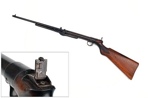 for 1920, with 17in. barrel (39 1/2in. overall), dove-tailed fore-sight, elevating rear-sight, rotating loading-tap with lever, plain air chamber, the top of trigger-unit marked 'A.G. PARKER & CO LTD BIRMINGHAM', the side with two holes, saw-handled walnut butt-stock chequered at the grip and inlet with a factory fitted peep-sight, ribbed end to butt, cast trigger-guard, the under-lever with 'push-button' style release and traces of finish