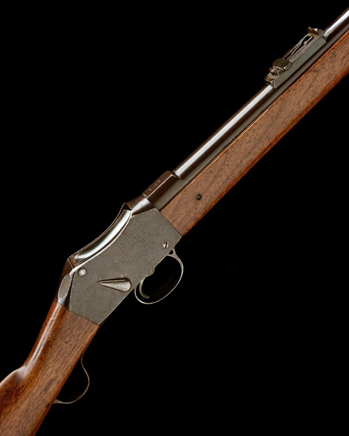 with 33 1/4in. unsigned barrel (missing fore-sight), the nocksform marked with a South African registration number, plain action with tear-drop cocking indicator, the left hand side inscribed 'SCHOLEFIELD, LONDON & BIRMINGHAM', walnut butt stock with iron heel-plate, three-quarter military-style fore-end, iron clearing rod under barrel and short under-lever, retaining traces of original finish.