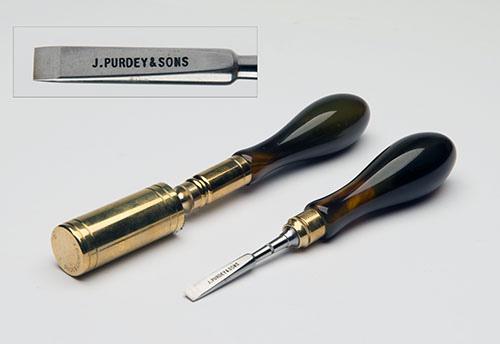 comprising of a brass and nylon three-piece cleaning rod a 12-bore chamber gauge, a medium turn-screw signed J. Purdey & Sons, all with mock tortoise shell handles