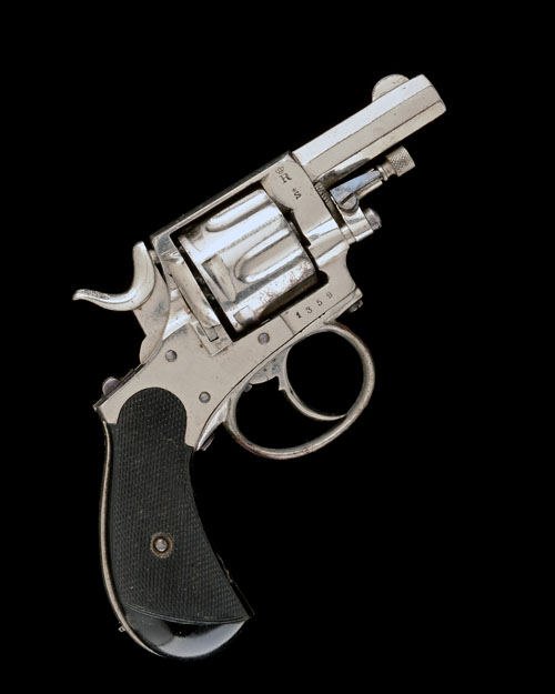 Belgian, circa 1880, with re-numbered octagonal 2in. barrel, crescent fore-sight, sighting groove to the top-strap, solid frame with rear-mounted sliding safety, fluted cylinder with load-gate, finely chequered birdshead ebony grips, guarded trigger and swing-out ejector-rod, much original plated finish remaining
