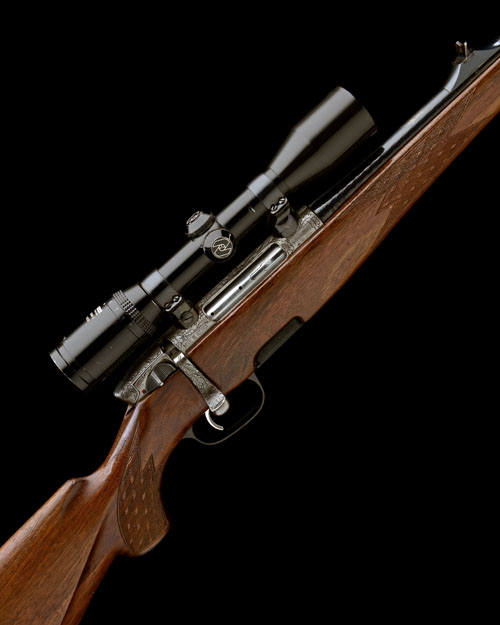 23 5/8in. fluted nitro barrel with block-mounted open sights and ramp-mounted sprung blade fore-sight, the receiver mounted with a Zeiss Diavari-C 3...9x36 telescopic sight, bolt and receiver deeply carved with oak leaves and acorns and with a woodland scene of roe deer, old silver finish, detachable box magazine, pistolgrip stock with monte carlo comb, pistolgrip-cap, left-handed cheekpiece, sling swivels, 14 1/2in. pull including 1 1/8in. rubber recoil pad