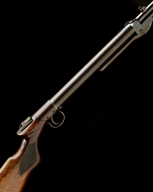 circa 1925, with 19 1/2in. blued barrel, dove-tailed fore-sight, dove-tailed rear-sight (adjuster and blade missing), plain air-chamber (traces of etched details), walnut chequered saw-grip butt-stock, the top of wrist factory inlet for a folding peep-sight (present), iron trigger-guard bow and push-button under-lever, strong traces of original finish