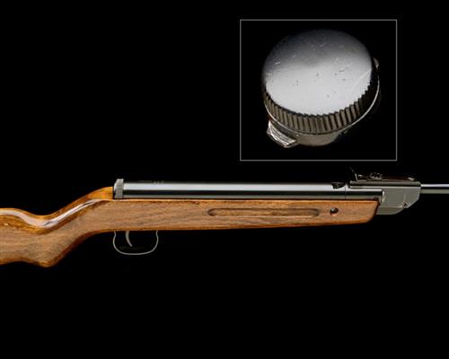 manufactured only in 1954, with blued 17 3/4in. barrel, ramp fore-sight, adjustable rear-sight, plain air-chamber signed 'WALTHER LG CAL 4.5 MOD 54MG, WALTHER'S PATENT', front of air chamber with aperture for six-shot magazine (missing) but retaining its ultra-rare single shot adaptor, beech half-stock and later rubber heel-plate, the whole retaining virtually all its original factory mirror blue finish