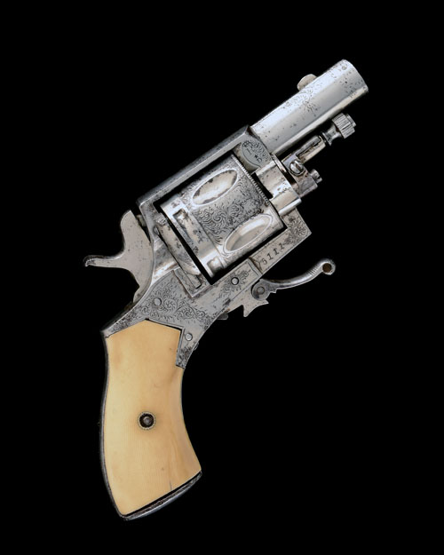 Belgian, circa 1880, with ovoid 1 5/8in. barrel, shallow crescent fore-sight, scroll engraving to the top-strap, borderline and scroll engraved frame, blind-fluted cylinder, smooth ivory grips, spurred hammer and folding trigger (return-spring weak), much nickel-plated finish