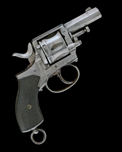 Belgian, circa 1880, with octagonal 2in. barrel, crescent fore-sight, sighting groove to the top-strap, solid frame, blind-fluted cylinder, chequered walnut grips, spurred hammer and guarded trigger, stripped of finish