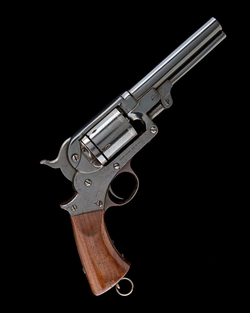 circa 1864 with later conversion, reblued shortened 5 3/8in. barrel, plain reblued hinged frame released by a side-screw, plain reblued cylinder, auxiliary standing breech with floating firing-pin, pinned under-barrel loading rammer, smooth walnut grip and lanyard ring at heel