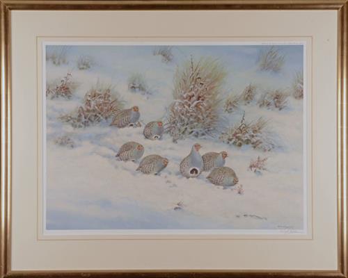 approx. 42in. x 34in. overall and depicting a covey of English partridge in a wintry setting, signed by the artist and single-mounted in a glazed gilt frame