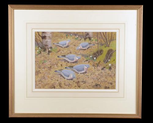 approx. 23in. x 19in. overall and depicting wood pigeon decoys set on beech leaves in an autumnal setting, signed by the artist and double-mounted in a glazed gilt frame