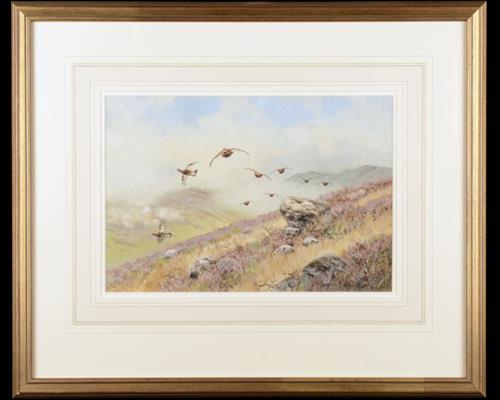 approx. 20in. x 17in. and depicting a pack of early season red grouse fast over a rock-strewn highland incline, signed by the artist and double-mounted in a glazed gilt frame