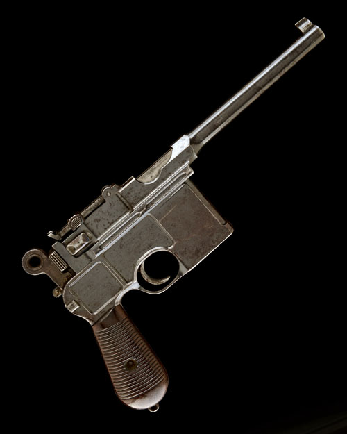 for 1898, with 5 1/2in. barrel, pinched block fore-sight, 500 metre rear-sight, long extractor-claw, milled side receiver, the left side centre panel amateurly inscribed 'C.H. BRUNNER, No.2724 I.Y.', large ring hammer and old style safe, 23-groove smooth walnut grips, provision for lanyard ring at pommel (missing) and integral ten-shot magazine, some external staining over original finish; COMPLETE WITH its matching number walnut holster-stock (distressed, majority of lid missing)