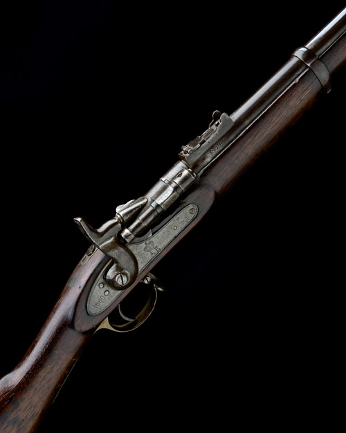 dated for 1860, with 36 1/2in. barrel, block and blade fore-sight, mount for ladder rear-sight (ladder missing), Birmingham and military proofs, flip-open breech-block signed 'SNIDER'S PATENT', military style bar-action borderline engraved lock stamped with a crown over 'A.E', the date stamped in large numerals at the tail, walnut three-quarter stock, brass furniture, three iron barrel-bands and iron under-barrel clearing rod