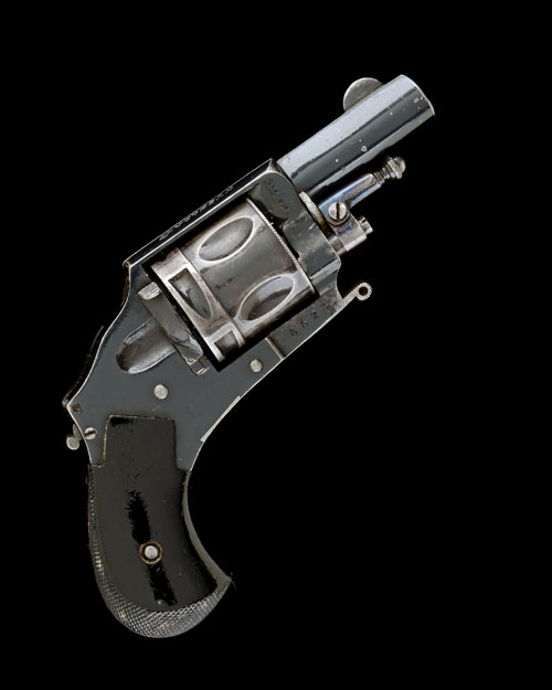Belgian, circa 1880, with blued ovoid 1 3/4in. barrel, crescent fore-sight, sighting groove to the top-strap, the top-strap signed 'HUZELLA, M. BUDAPEST', blued solid frame with rear-mounted button safety, blued blind-fluted stepped cylinder with milled coin edge to the front, smooth sided birdshead ebony grips with chequered backs, folding trigger and swing-out ejector-rod, much original finish remaining