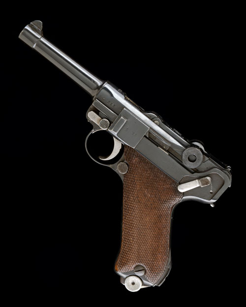 dated for 1917, with blued 4in. barrel, dove-tailed blade fore-sight, notch rear-sight to the rear toggle-link, the top of toggle signed 'ERFURT', blued receiver, blued frame, the back-strap marked 'J.R.471.1.M.G.K.26.' chequered walnut grips, all matching numbers except later aluminium based magazine, older refinish throughout