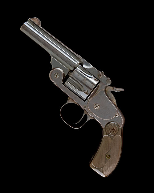 for 1894, with round 3 1/4in. barrel, raised sighting rib, the top signed and with patent dates to May 11th 1880, the centre marked ''MODEL OF '91', crescent fore-sight, break-open frame, fluted cylinder and chequered hard-rubber grips with 'S&W' monogram, the whole with much blued finish under surface staining