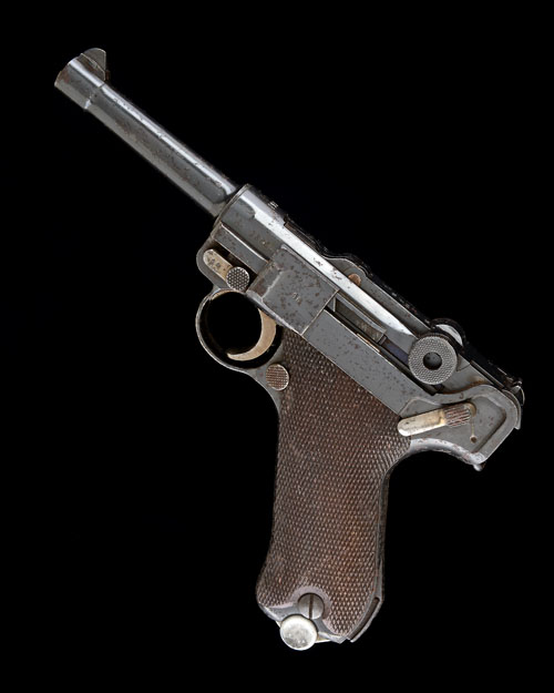 dated for 1937, with blued 4in. barrel, dove-tailed blade fore-sight, notch rear-sight to the rear toggle-link, the top of toggle signed with the makers mark 'S/42' for 'Mauser', blued receiver, blued frame, chequered walnut grips, all matching numbers including aluminium based magazine, speckled surface corrosion to the original finish, 'straw' colour to ancilliaries