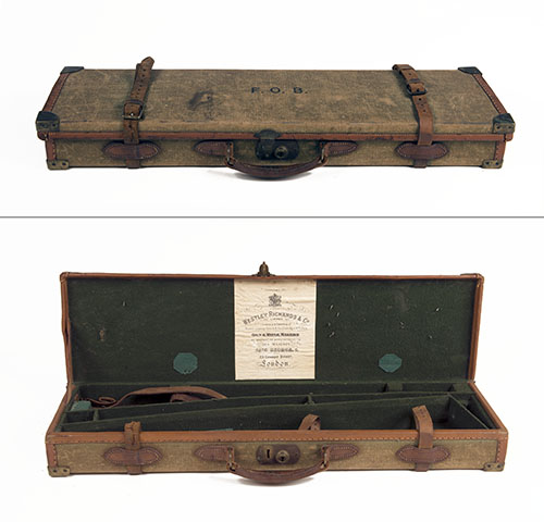 fitted for a 29in. barrel, the interior lined with green baize, with a Westley Richards trade label, brass lock (key missing), the lid exterior with the monogram 'F.O.B.'