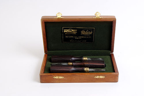 A CASED SET OF TURNSCREWS, small (damaged, medium, large) turnscrews, green baize lined oak case with William Powell trade label