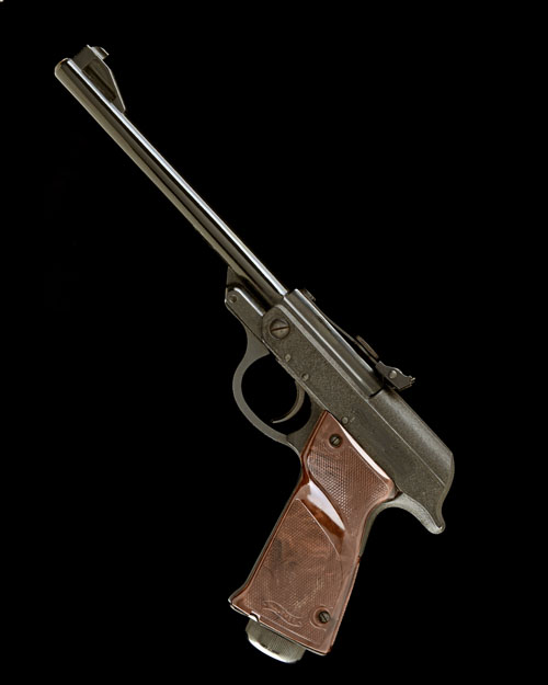 circa 1965, with black anodised 9 1/2in. barrel, black crackle-finished receiver marked 'B.E.A. CORPORATION' under the Walther trademark, brown chequered plastic grips, remaining in fine condition with much original finish; TOGETHER WITH its makers brown card carton, wood cocking aid, sighting elements cleaning rod and patches (box scuffed at corners)