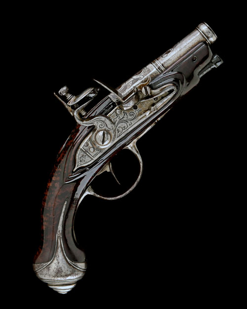 probably French circa 1770, with two-stage 3in. cannon barrel, false rifling at the muzzle, rococo scroll engraving to both barrel-stages, solid top-tang, borderline and scroll engraved bevel-edged flat lockplate with stepped tail (front side nail missing), unbridled frizzen, fruitwood full-stock, iron furniture including long-eared butt-cap with snail pommel, moulded and engraved sideplate and engraved trigger-guard bow