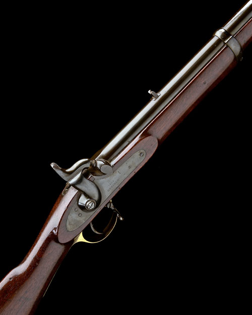 dated for 1864, with 39in. blued barrel, block and blade fore-sight, standing notch rear-sight, farsi marks and military proofs at breech, plain lock signed 'ENFIELD' under the date with crown and 'V.R.' to tail, Indian ordnance acceptance stamps, walnut three-quarter butt-stock with brass furniture (tang stamped with serial number), three iron barrel-bands and iron jag-ended ramrod, much original finish