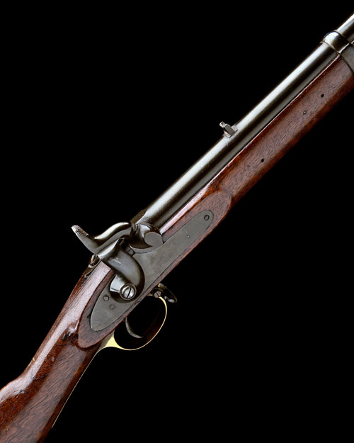 dated for 1864, with 39in. blued barrel, block and blade fore-sight, standing notch rear-sight, farsi marks and military proofs at breech, plain lock signed 'ENFIELD' under the date with crown and 'V.R.' to tail, Indian ordnance acceptance stamps, walnut three-quarter butt-stock with brass furniture (tang stamped with serial number), three iron barrel-bands and iron jag-ended ramrod, strong traces of finish