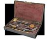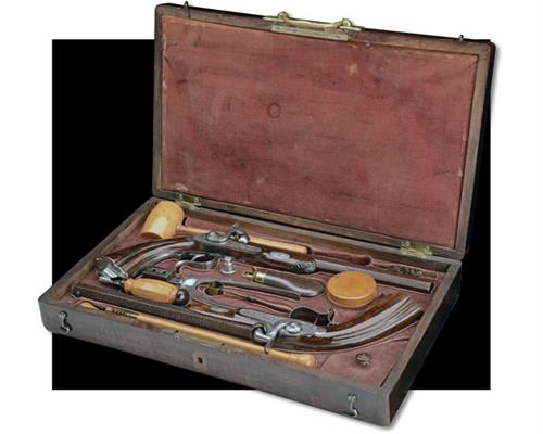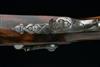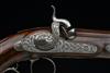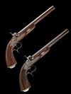 circa 1850, the browned octagonal 10in. rifled barrels marked in script on the top-flat 'DAMACE ANGLAISE', dove-tailed bead fore-sights, standing notch rear-sights, polished breech-blocks with border engraving, floral and ribbon engraving to the top-tang and locks, the locks signed 'RENAULT A ST ETIENNE' beneath the hammers, dipped tails, the hammers engraved en-suite, figured walnut half-stocks, fluted butts, iron furniture including spurred trigger-guard bow engraved en-suite, shell carving to the fore-end tip, no provision for ramrod, the whole in fine condition and retaining much finish; COMPLETE WITH its manufacturers walnut case, compartmented and lined in the continental fashion using red baize (faded) and containing a full complement of accessories