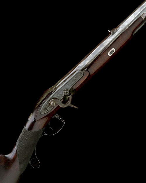 circa 1835, with slightly swamped 28in. rifled octagonal barrel, the top-flat signed 'W. PARKER GUN MAKER TO HIS MAJESTY HOLBORN, LONDON', dove-tailed boat-shaped fore-sight, dove-tailed standing notch rear-sight with additional folding leaf, large borderline and scroll engraved side bolster, scroll engraved top-tang, inverted borderline engraved bar-action lock signed 'W. PARKER' (also inverted), scroll engraving to the lock-bar, martial trophy engraved to the tail and radiant needles engraved forwards of the scroll engraved hammer, walnut half-stock with finely chequered wrist, iron plate applied behind the nipple as a heat guard, iron heel-plate with engraved spur, engraved trigger-guard bow with scrolled tang, iron ramrod throat and mushroom-headed ebony ramrod