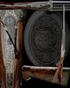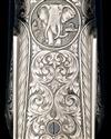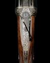 23 7/8in. nitro barrels (London proofed in 2001), bold acanthus scroll-engraved sight rib with open sights and folding leaf sight marked for 50 and 150 yards, ramp-mounted bead fore-sight, broad concave rib engraved 'THOMAS BLAND & SONS', tubes engraved 'CAL 500 NITRO EXPRESS 3" REG FOR 570 GR BULLET AT 50 YDS', treble-grip action with hidden third bite, removable striker discs, side-bolsters, elongated top tang with manual safety and gold-inlaid 'SAFE' detail, gold-inlaid cocking-indicators, articulated front trigger, rolled-edge triggerguard, the action, lockplates and furniture fully engraved with bold scrolling acanthus motifs on a matt background, the fences carved in high relief in a stylised grape and vine design with feathered bordering, the underside with a circular vignette carved in high relief with a charging African bull elephant, 14 7/8in. highly-figured pistolgrip stock with cheekpiece, engraved steel pistolgrip-cap (with trap) and including 3/4in. leather covered recoil pad, weight 9lb. 13oz., in its green baize lined brass-cornered leather case