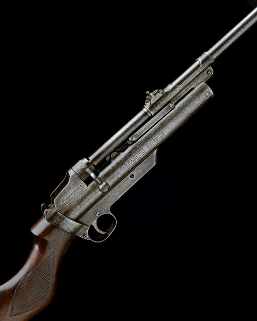 circa 1937, with detachable 25 1/2in. sighted barrel, bolt-action unlocking, air-chamber with five countries patent stamp, provision for aperture rear-sight to rear of receiver (missing), walnut chequered saw-grip butt-stock, horn heel-plate, minimal traces only of finish