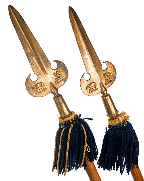 A PAIR OF ENGLISH 'PARTISAN' POLE-ARMS WITH DECORATED AND GILDED BLADES, circa 1860, each approximately 93in. overall, the blades with central ridges and symmetrical side-blades, each side blade decorated with an applied gilded elephant sporting a cross on its side and an applied gilded stork perched above a cradled infant in turn above a key above a wreath, plain oak hafts with woollen tassels at neck, some wear to the gilding