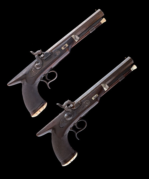 the pair being a consolidation of 19th century parts, with etched damascus rifled 7 1/2in. octagonal barrels, bead fore-sights, solid top-tangs, bar-action locks reduced in size and converted from flint (some pitting), walnut saw-handled butts with chequered grips, applied carved ivory pommels, spurred trigger-guard bows, white-metal fore-end caps and applied under-barrel ribs with ivory tipped mahogany ramrods; TOGETHER WITH a mahogany lidded walnut storage case re-lined and compartmented for these pistols in purple baize