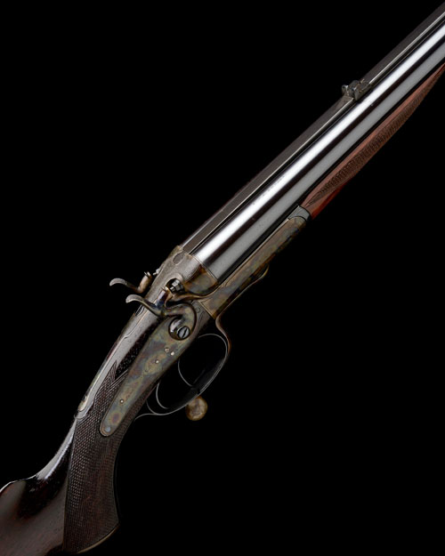 27in. black powder only barrels with broad raised matt rib, open sights and folding leaf sight with white metal inlaid sight-lines and marked for 150 and 250 yards, bead fore-sight, tubes engraved 'ARMY & NAVY C.S.L. LONDON.', treble-grip action with carved percussion fences, rebounding back-action locks, border engraving, retaining virtually full renewed colour-hardening and finish, 14in. figured pistolgrip stock with horn pistolgrip-cap, sling eyes and steel buttplate, fore-end with grip-catch release and replacement wood, weight 8lb. 15oz.