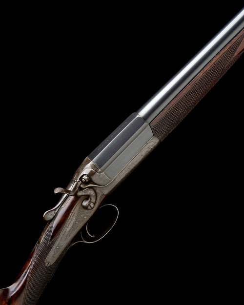 30in. nitro reproved barrel, hexagonal breech section engraved 'CHARLES LANCASTER', 2 3/4in. chamber, bored approx. full choke, carved percussion fence, rebounding back action lock signed 'CHARLES LANCASTER' and with border and acanthus scroll engraving, retaining slight traces of original colour-hardening, 13 1/8in. figured stock, fore-end with horn finial, weight 5lb. 1oz.