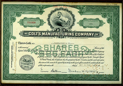 COLTS MANUFACTURING CO, USA A FRAMED SHARE CERTIFICATE FOR FIFTY $25 SHARES, serial no. D11950,