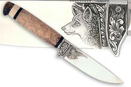 recent, with fixed 4in. drop-point blade, the ricasso engraved with a foxes head emerging from foliage on the left hand side and a pheasant taking flight on the right, floral engraving to the cross-guard, polished bone handle with ebony bands, a further pale bone band to the pommel, no scabbard