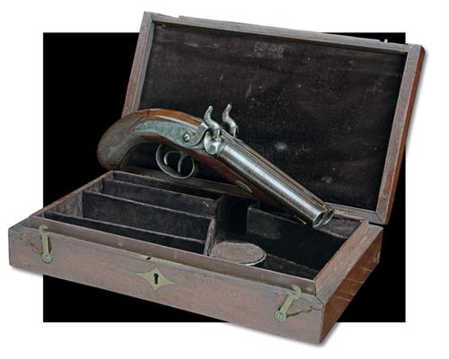 A CASED 18-BORE PERCUSSION SIDE-BY-SIDE RIFLED HOWDAH-PISTOL, no visible serial number,