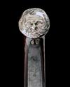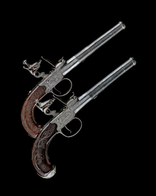 the mounts hallmarked for Birmingham, 1783, with round tapering banded 4in. cannon barrels, rounded breeches with private proofs, squared boxlock central hammer actions, signed 'R. BLISS' on the left and 'LONDON' on the right within banners surrounded by scroll engraving (one action body with blind crack), walnut bag-shaped butts inlaid with silver wire scrolls (small losses), the butt-caps of silver and embossed with grotesque masks and sliding trigger-guard bow safes